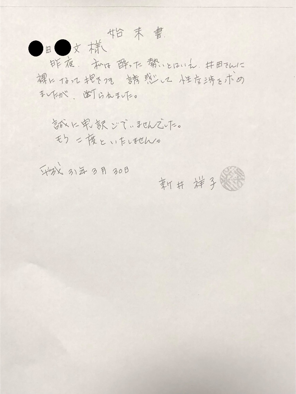 (井田氏に裸で迫って失敗したことへの始末書)